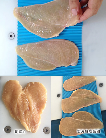 Chicken breast of butterfly heart shape can be cut and processed by replacing cutter. The floating net belt design is suitable for different thickness of meat block, and can be designed into multiple layers of different thickness;