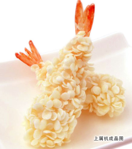 The bread crumbs are evenly wrapped in chicken, beef, pork, fish, shrimp and other seafood products through the breading machine of multiple rows and mass production by lower sticking and upper sprinkling.
